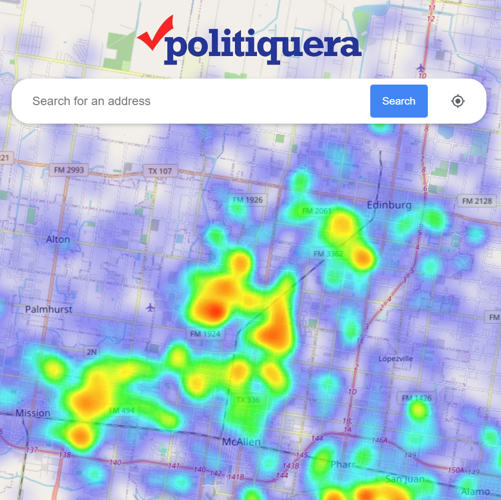 Welcome to Politiquera.com! This map shows you who has early-voted in Hidalgo & Cameron County according to their voter turnout rosters. Use this to see who's voted in your City, Community or on your block. If they haven't voted, you can use this as a conversation starter to encourage them to get out and vote! Thanks for visiting!